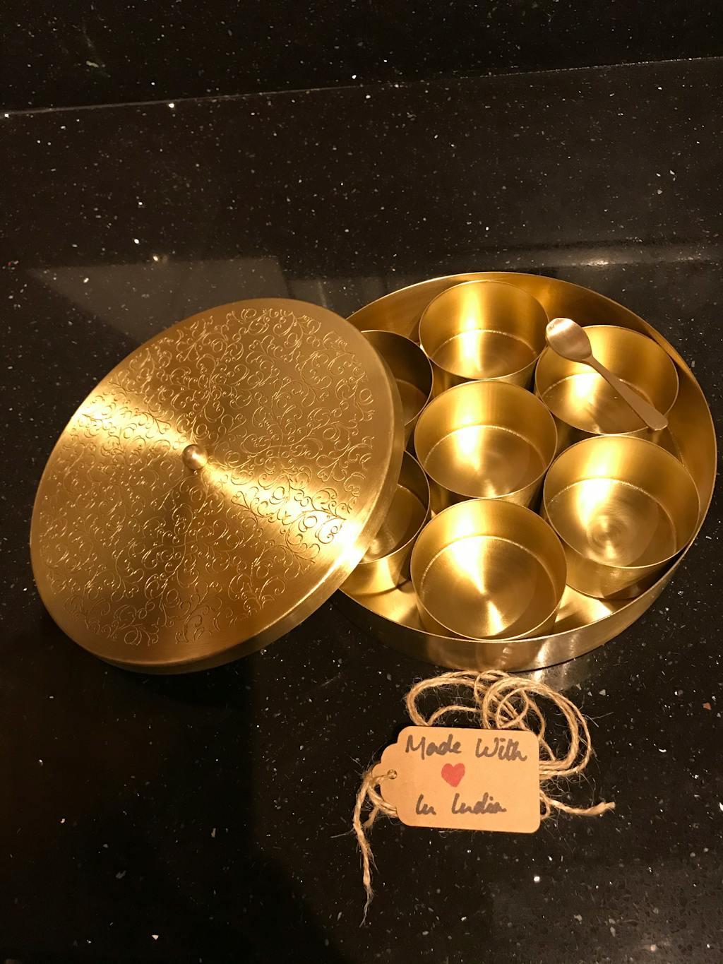 Ataranj comes with 7 brass containers and a brass spoon for your top 7 spices but don't let tradition get in the way of customisation. Use it to store snacks, mukhwas (Indian mouth fresheners), knick-knacks, or jewellery. Just avoid storing salt in your Ataranj.
